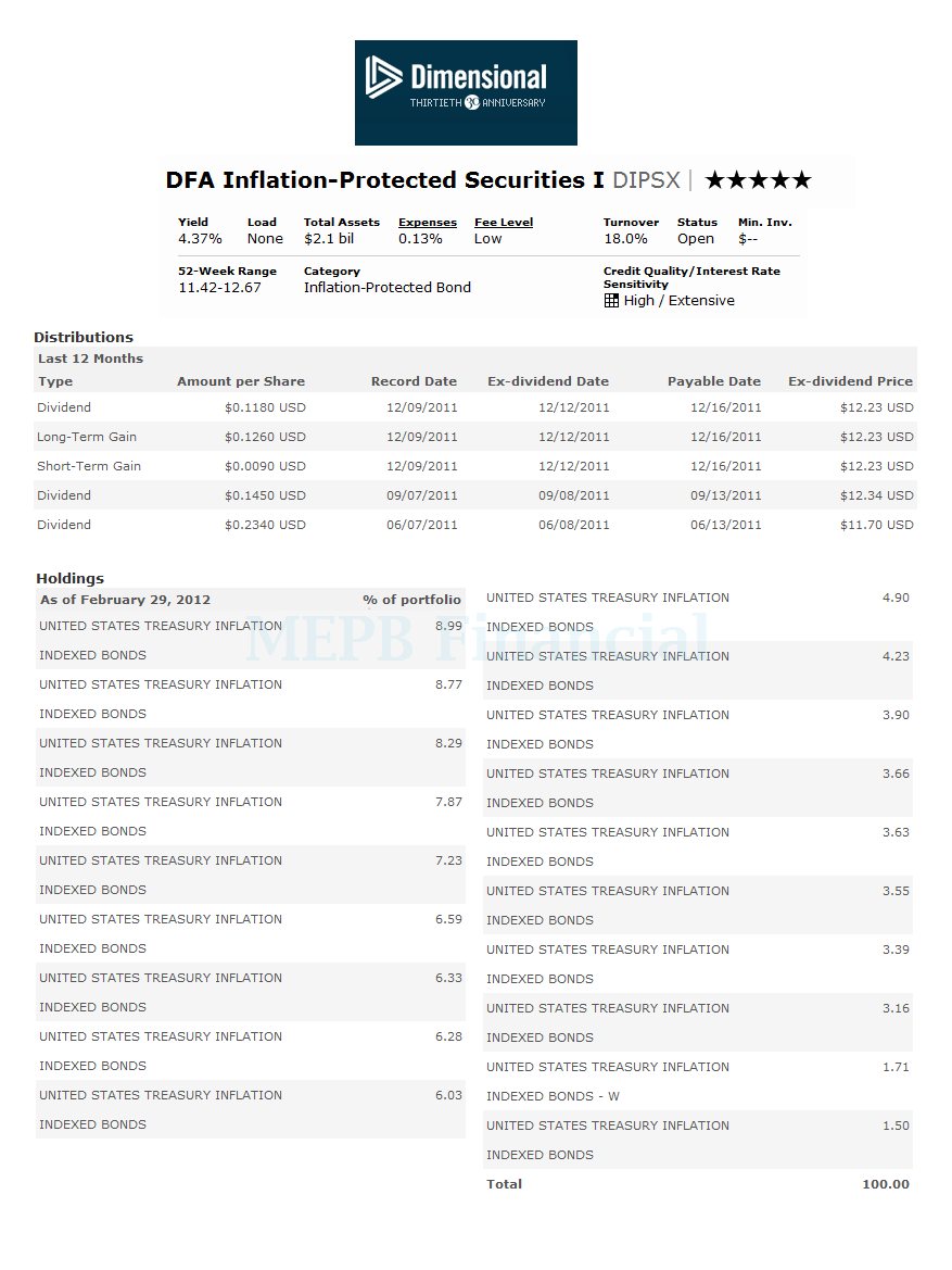 | 1 | DFA Inflation-Protected Securities I | DIPSX | 15.46% | 11.92% | 8.34% | - | 0.13% |